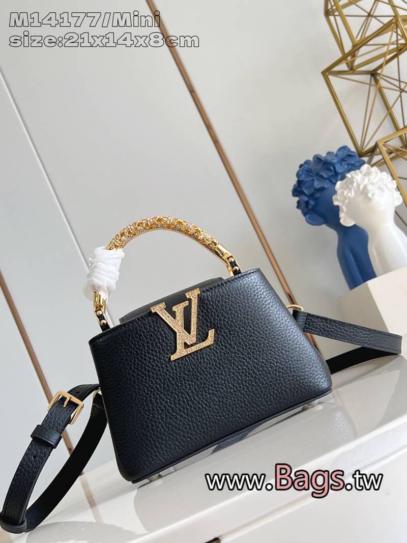 高仿LVM14177黑/迷你 本款 Capucines 迷你手袋出自 Exceptionals 系列,以 Taurillon 牛皮革演繹收藏佳選。萊茵石為 LV 字母註入珠寶質感,耀目花卉形狀手柄援引經典 Flower Crown 項鏈設計。可隨心切換多種背攜方式,翻蓋內收或外置皆宜。21 x 13.6 x 8 (厘米) (長 x 高 x 寬) JQ2550