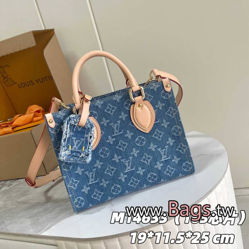 超A版本LV【163C01 芯片版】 款號: M14633, 原單加強版【獨傢實拍背景圖】✨本款 OnTheGo 小號手袋為經典 Monogram 丹寧佈勾勒牛皮革飾邊,搭配耀目金屬件和磁扣翻蓋開合。充裕空間可容納平板電腦和日常所需,可拆卸肩帶實現手提或斜挎。19 x 11.5 x 25 厘米(高 x 寬 x 長度)Q1450
