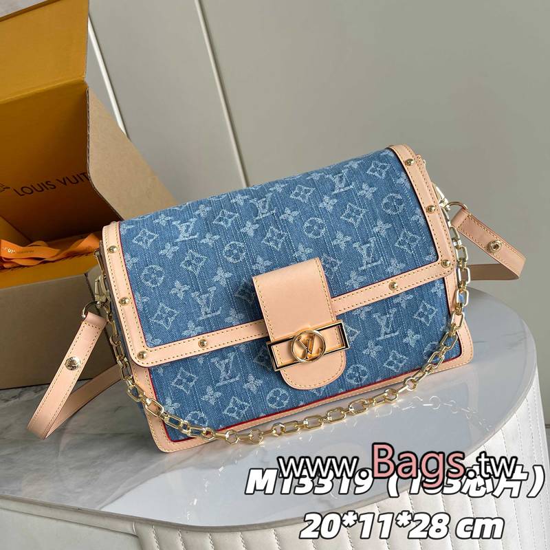 高仿LV【163C01 芯片版】款號: M13319, 原單加強版【獨傢實拍背景圖】✨本款 Dauphine Soft 大號手袋以 Monogram Hl丹寧佈煥新演繹經典廓形,為考究設計點綴 LV 字母、可拆卸鏈條和可調節皮革肩帶,與牛皮革飾邊相映成趣。拉鏈內袋穩妥收納小件物品。尺寸:20 x 11 x 28 厘米 (高 x 寬 x 長度)Q1690