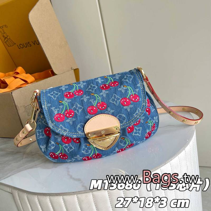 一比一LV【163C01 芯片版】 款號: M13680, 原單加強版【獨傢實拍背景圖】✨這款Sunset手袋採用復古版型剪裁,散發從容優雅氣息,粗圓角飾邊完美配襯大型金色插式鎖扣。手袋以Monogram牛仔佈製作,綴有玩味亮麗的櫻桃刺繡圖案,取材自迷人的復刻版Louis Vuitton x Murakami系列,加上飾釘天然皮革肩帶,體現品牌經典格調。27 x 18 x 3 厘米(長度 x 高度 x 闊度)Q1490
