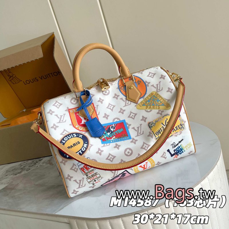 LV【163C01 芯片版】款號: M14587, 原單加強版【獨傢實拍背景圖】✨本款 Speedy Soft 30 手袋以復古筆觸演繹 Monogram Dune 元素,搭配飛機造型裝飾和拼貼效果標簽,致意 Gaston Louis Vuitton 典藏系列設計。長款手柄便於肩背,成就又一旅行佳伴。塗層帆佈一牛皮革飾邊一金屬件一雙拉鏈開合一拉鏈內袋一鑰匙包一貼飾名牌一飛機造型裝飾一可收納 9 寸平板電腦、6.7 寸智能手機、Zippy 長款錢夾、耳機、鑰匙、紙巾、口紅和太陽眼鏡一肩帶:可拆卸,不可調節!!型號:M14587;尺寸:30x21x17CMQ1450