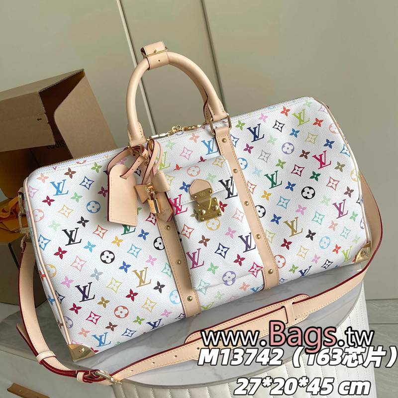 最頂級高仿LV【163C01 芯片版】 款號: M13742 原單加強版【獨傢實拍背景圖】本款 Keepall Bandoulière 45 旅行袋出自路易威登 x 村上隆再版系列,以絢麗 Monogram 塗層帆佈展現品牌標志性元素與藝術傢虹彩美學的創意交融。前袋的 S-lock 鎖扣和瑩澤金屬包角奠定經典底蘊,鉚釘飾帶和蝴蝶結造型鑰匙包點明新季潮流風尚。27 x 20 x 45 厘米(高 x 寬 x 長度)Q1880