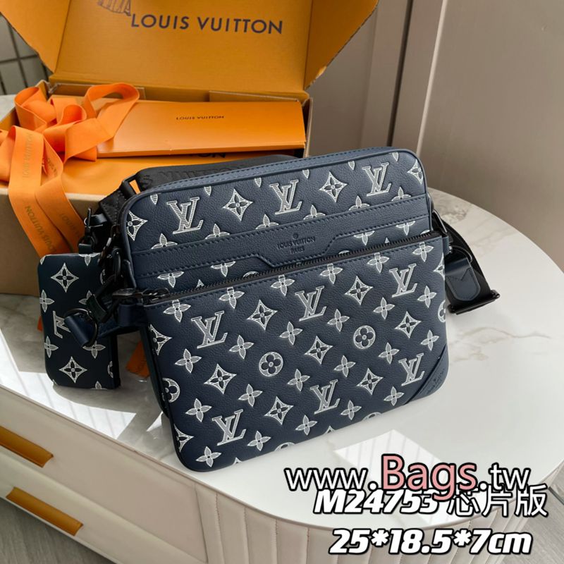 高仿LV路易威登款號: M24753藍色 原單加強版【獨傢實拍背景圖】本款 Trio 郵差包取材Monogram Shadow牛皮革,先後采用壓印和印花工藝描繪 Monogram圖案,以啞光效果彰顯俊朗氣息。零錢包、主隔層和可拆卸前袋均可單獨使用,實現三合一功能。尺寸:25 x 18.5 x7厘米(長度x高x寬)Q1450