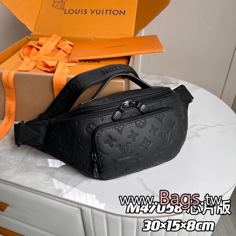 A貨LV【163C01 芯片版】 款號:M47058黑色 壓花 原單加強版本款 Rush 腰包以 Monogram Shadow 牛皮革塑造貼身構型,其拉鏈前袋方便取放手機、鑰匙和卡片。可調節背帶通過滑鉤束緊,輕松實現系腰、肩背或斜挎,皮革手柄再添手提選擇和運動風范。30 x 15 x 8 厘米 (長度 x 高 x 寬)Q1290