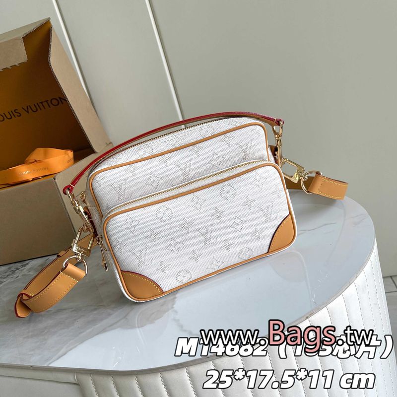 高仿包包LV【163C01 芯片版】 款號: M14682白色, ✨Pharrell Williams 采用 Monogram Heritage 塗層帆佈重釋 Nil 手袋,以海洋色調演繹復古風潮。緊湊構型囊括拉鏈主隔層和拉鏈前袋,俊朗包角回溯制箱傳承。頂部手柄和皮革肩帶均可拆卸,實現多種背攜方式。尺寸:25 x 17.5 x 11 厘米(長 x 高 x 寬 )Q1290