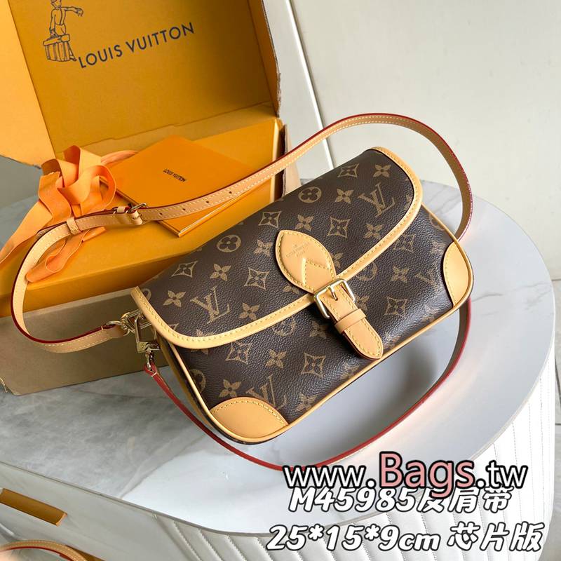 高仿LV路易威登【變碼芯片版】 款號: M45985皮肩帶 原單加強版【獨傢實拍背景圖】 M45986皮帶、M46049玫紅,M45985杏色, 此款 DIANE 手袋配有一根皮肩帶(可腋下背)一根刺繡肩帶(可肩背斜跨)都可以拆卸。容量日常足夠用裝最大號手機毫無壓力,皮帶式的扣扣是裝飾其實是磁鐵開合還算比較方便~中間有隔層,方便整理東西,還有個拉鏈區,可以放些貴重物品。尺寸:25.0 × 9.0 × 15.0CM (長 × 寬 × 高)Q1290