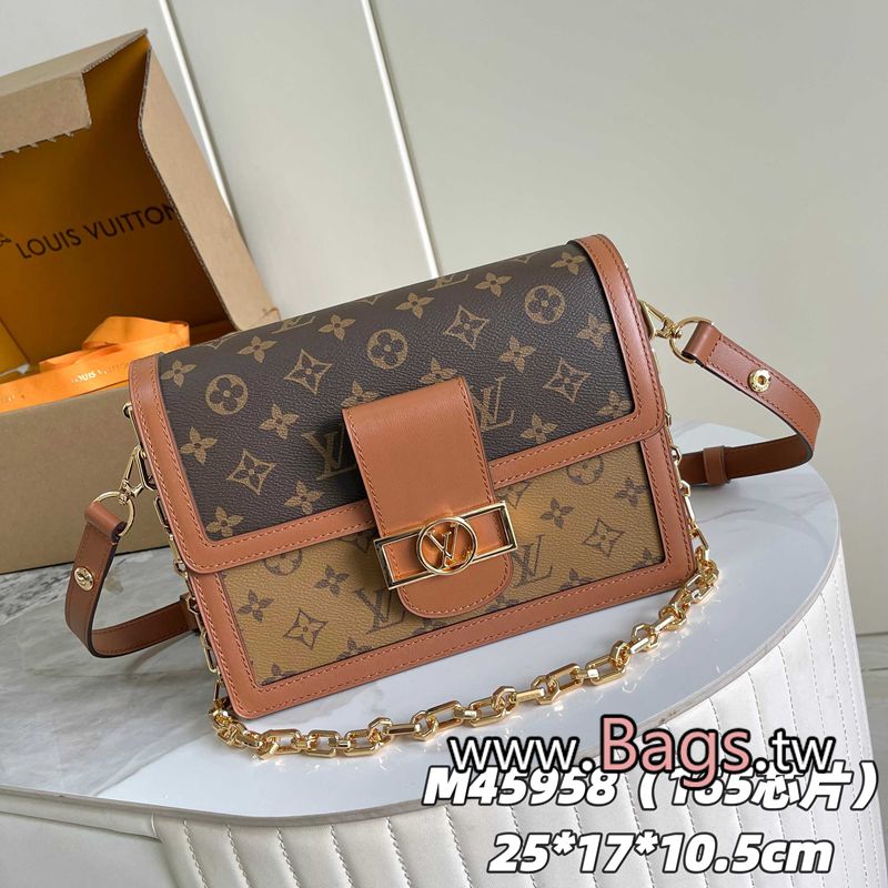 高仿LV【165 芯片版】原單加強版【質量全面升級】獨傢實拍背景圖、 M45958中號手袋 路易威登經典 Dauphine 手袋系列新作:來自 2019 早春系列,出自女裝藝術總監 Nicolas Ghesquière 之手的改良版設計。將 Monogram 帆佈與 Monogram Reverse 帆佈相結合,配有鏈帶與磁扣,以摩登風格展現品牌傳統,盡顯路易威登時尚稟賦。尺寸:25.0 x 17.0 x 10.5 厘米 (長 x 高 x 寬)Q1650