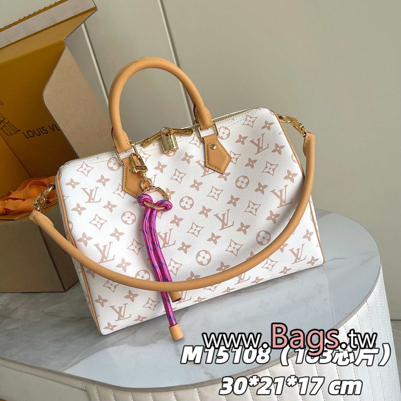 超3ALV路易威登【163C01 芯片版】 款號: M15108 原單加強版【獨傢實拍背景圖】✨本款 Speedy Soft 30 Lucky 手袋為 Monogram 帆佈勾勒 VVN 皮革飾邊,再借宛若珠寶的可拆卸裝飾、撞色內襯和金屬件點亮考究細節。充裕構型可輕松容納平板電腦與日常所需。21 x 17 x 30 厘米 (高 x 寬 x 長度)Q1490
