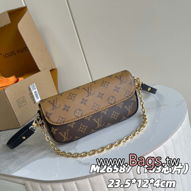 LV【163C01 芯片版】 款號: M26587,M81911 原單加強版✨‼️本款 Wallet On Chain Ivy 手袋取材 Monogram Reverse 帆佈,巧妙展現當季定向思維。可拆卸金屬鏈條與 LV 字母相得益彰,齊整內裡設有貼袋和卡位,可穩妥收納日常所需。Monogram Reverse 塗層帆佈一牛皮革飾邊一織物內襯一金屬件一磁扣開合一卡片夾層一貼袋一拉鏈袋一主隔層一可收納智能手機、耳機、Romy 卡夾、太陽眼鏡、鑰匙和口紅一肩帶:可拆卸,可調節!!;尺寸:23.5x12x4.3CMQ1090